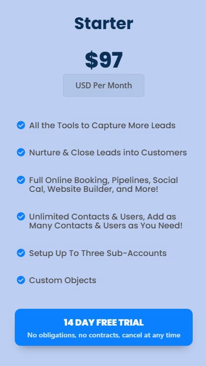 We want you to be completely confident in your decision to scale your business with GoHighLevel. That’s why we invite you to put our all-in-one platform to the test with a risk-free 30-day trial.